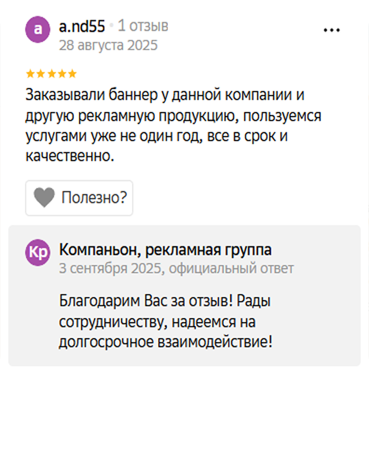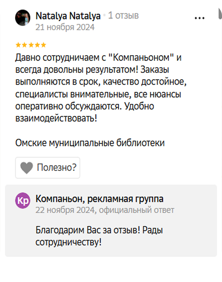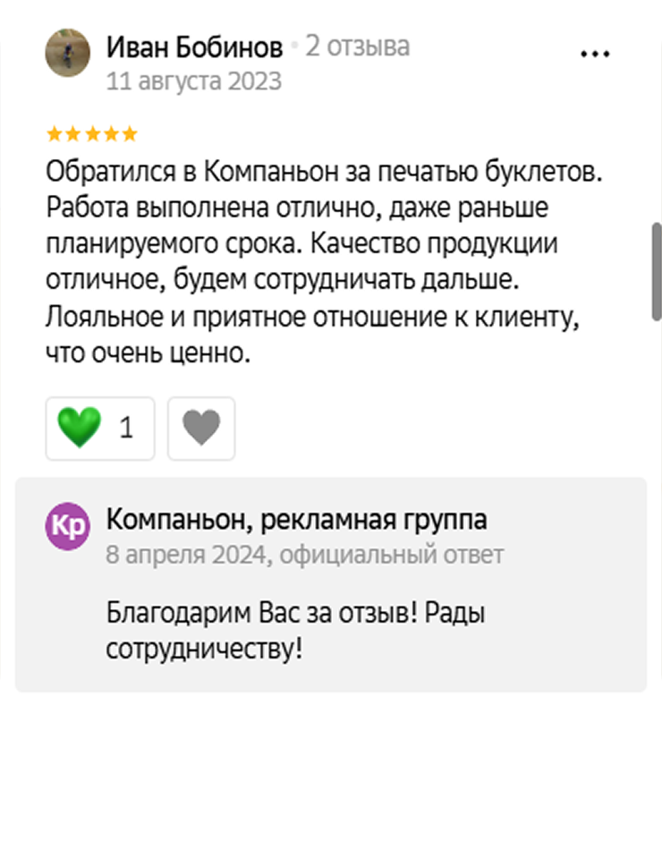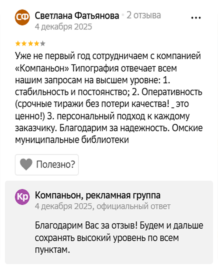 Компаньон — команда профессионалов в области полиграфических услуг и корпоративного дизайна. Наша цель — помочь вашему бизнесу выделиться на рынке и привлечь больше клиентов.